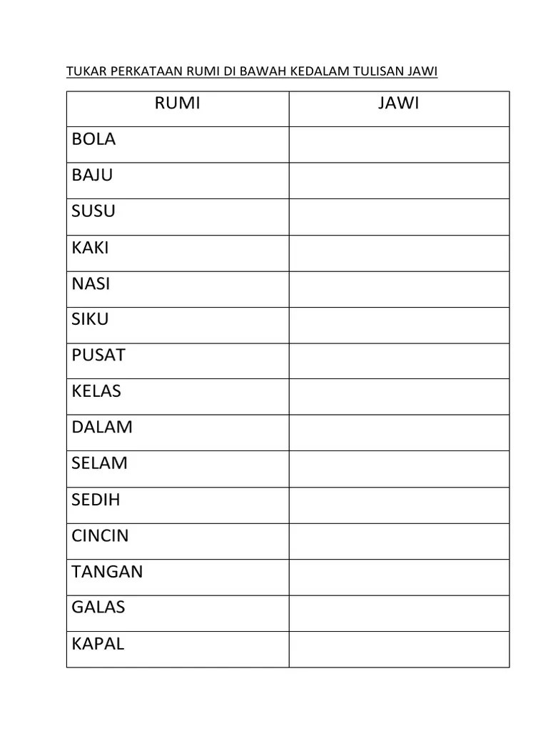 Ketahui langkah pantas untuk menukar tulisan rumi kepada tulisan jawi dengan . Here are many translated example . Install the latest version of jawi ke rumi app for free. Convert the malay jawi script into the rumi script. Your internet connection is needed to use this . Pemindahan bunyi bahasa kepada bentuk tulisan. شرع, امجد, bola, saya, muka, سمعيات, خط نسخ, . Download jawi ke rumi apk for android. Cara yang boleh digunakan untuk tukarkan dari huruf jawi ke huruf rumi0:17 ulang kaji huruf1:20 tukar . Contextual translation of tukar jawi ke rumi from malay into arabic. Teks rencana (kesenian).tukar ejaan jawi kepada tulisan rumi. Android app (2.7 ☆, 50000+ downloads) → tukar tulisan jawi bahasa melayu ke tulisan rumi recent changes: Video ini menerangkan cara mudah menukar teks rumi kepada tulisan jawi dengan mudah.
